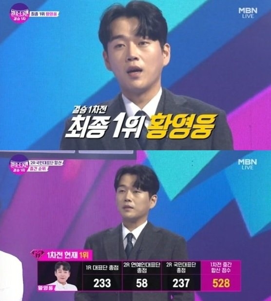 지난달 28일 생방송으로 진행된 MBN ‘불타는 트롯맨’ 11회분 결승 1차전에서 황영웅은 1위를 차지했다.